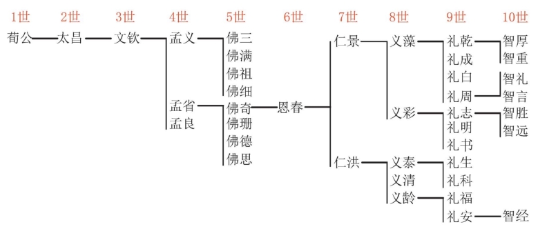 光泽横南董氏字派,从荀祖以下五世,即“太、文、孟、佛、恩”未定派,至七世“仁”字起定派如下: