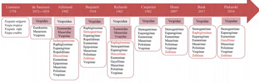 de Saussure(1852—1858)首次提出将胡蜂划分为3个族即马萨胡蜂族Masarini、蜾蠃族Eumenini和胡蜂族Vespini;Smith(1857)将胡蜂分为3个科即马萨胡蜂科Masaridae、胡蜂科Vespidae和蜾蠃科Eumenidae;Bingham(1897)将胡蜂归为针尾部5个族之一,其下划分2个科即蜾蠃科Eumenidae和胡蜂科Vespidae。Ashmead(1902)将胡蜂科提升为胡蜂总科Vespoidea,其下包括三个科即蜾蠃科Eumenidae、马萨胡蜂科Masaridae和胡蜂科Vespidae;Bequaert(1918)又将这3个科合并为胡蜂科并将科下划分为10个亚科。胡蜂科的分类系统频繁变迁,在此期间围绕胡蜂科下有多少个亚科这一问题,昆虫学界一直存在争议。直至1962年,Richards再次将胡蜂总科划分为3个科即蜾蠃科Eumenidae、马萨胡蜂科Masaridae和胡蜂科Vespidae,在1962—1980年此分类系统被大多数学者采用。