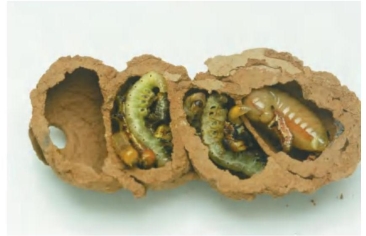 1.亲代为幼虫准备的食物 2.蜾蠃幼虫 3.蜾蠃蛹(江西赣州 黄敦元 摄)