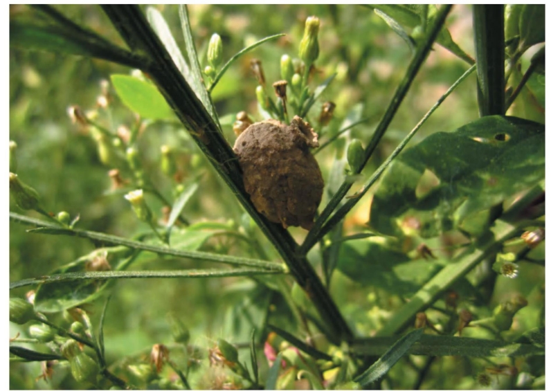 蜾蠃亚科Eumeninae种类营独栖生活,即成虫平时营自由生活取食花粉和花蜜(图1-2)。雌蜂仅在繁殖时筑巢,它们通过衔泥(图1-3~图1-5,图1-10),在竹管、芦苇秆等孔洞中(图1-8)在土中或干木头中挖洞筑巢(图1-7),巢穴仅1个巢室或几个巢室相邻,巢室明显比社会性种类的巢室少,雌蜂外出主要捕猎鳞翅目昆虫的幼虫(图1-12),将其蜇刺麻醉后衔回并储存于巢内(图1-6)。蜾蠃卵孵化为幼虫后取食亲代为其准备好的食物(图1-9,图1-11)。