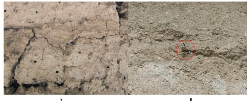 A.土墙上的巢穴 B.直盾蜾蠃属种类正在筑巢