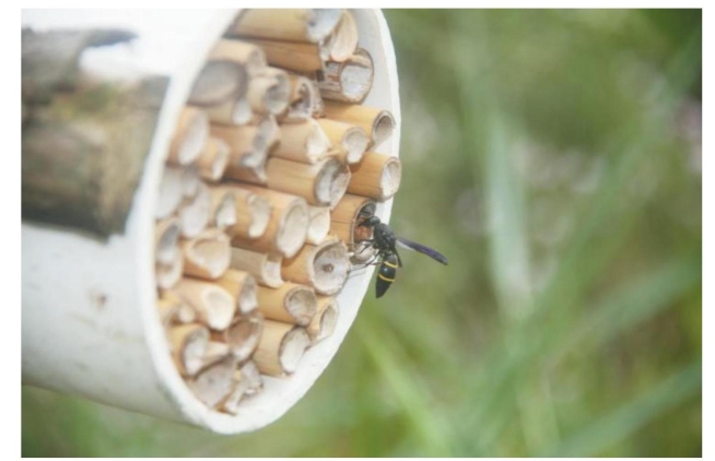图1-8 黄缘代喙蜾蠃Dirhynchiumflavomarginatum在竹管中筑巢(江西赣州 黄敦元 摄)