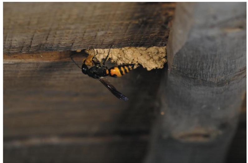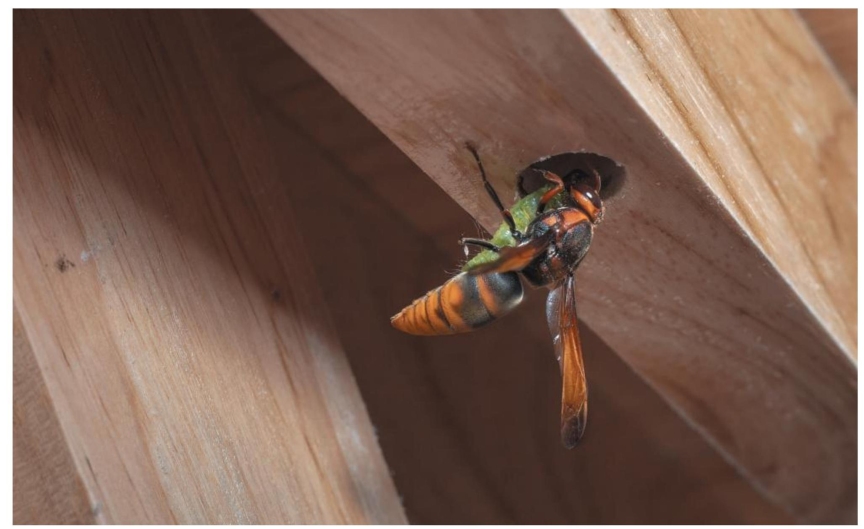 图1-6 黄喙蜾蠃指名亚种Rhynchium quinquecinctum quinquecinctum衔猎物回巢(浙江温州 何既白 摄)