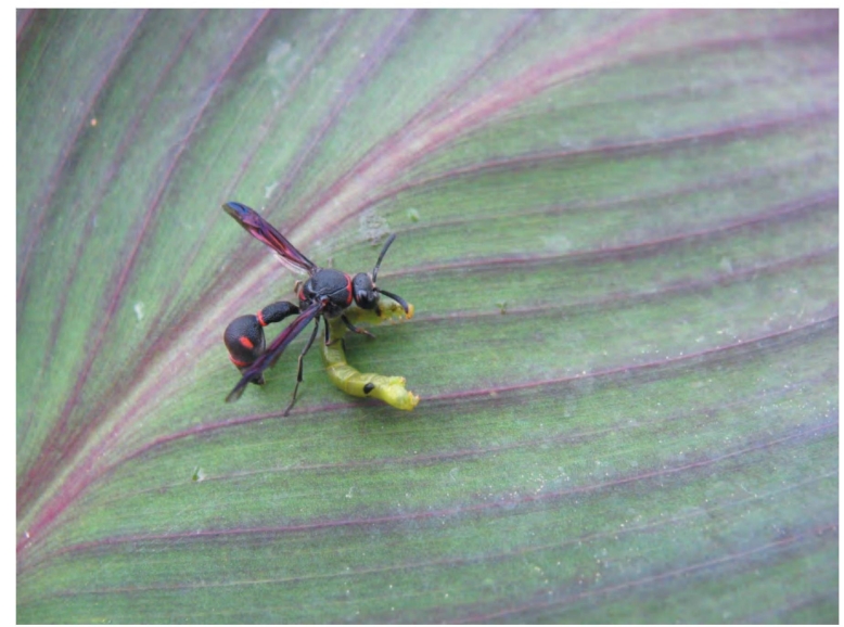 图1-12 凸圆蜾蠃Eumenes gibbosus捕猎鳞翅目幼虫(云南腾冲)