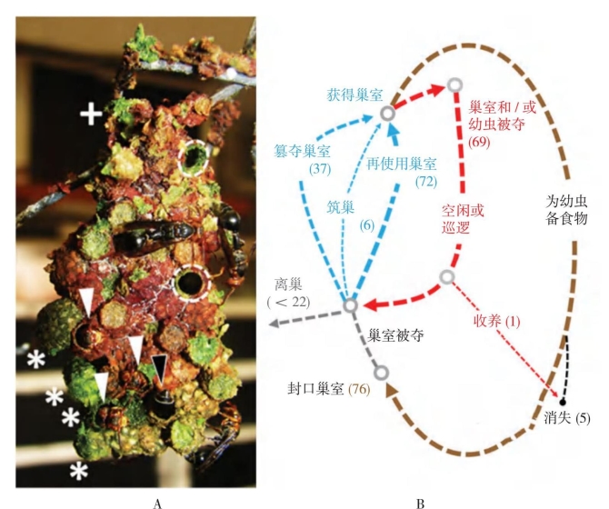 长腹胡蜂亚科Zethinae种类曾属于蜾蠃亚科中的一个族,近几年结合分子数据及蜂群筑巢习性等分析将其独立为亚科,其系统演化位于独居性的蜾蠃亚科Eumeninae与社会性的马蜂亚科Polistinae和胡蜂亚科Vespinae之间。该亚科中长腹胡蜂属Zethus和丽腹胡蜂属Calligaster的某些种类用植物材料建造巢穴而非用泥筑巢,以及少数种类如红棕长腹胡蜂Zethus miniatus的雌性共享同一个巢穴,每只雌性以渐进的方式供养自己的后代,它们在繁殖时表现出统治地位(类似女王的行为),并且在提供巢穴时偶尔执行有利于其他个体的任务(类似工蜂的行为)。因此,长腹胡蜂亚科Zethinae种类具有从独居生活方式向群居生活方式转变的特征。最新研究结合行为观察和雌性卵巢状态数据发现:寻求再次使用或篡夺幼虫巢室的攻击性繁殖者比幼虫的提供者拥有更长的卵母细胞,而那些缺乏繁育的雌性(如那些巢室被篡夺的受害者)却执行与巢穴防御、巢穴维护和/或收养孤儿巢等相关的任务(图1-38)。因此,巢室的竞争可能塑造了蜂群社会性分工的生殖生理学。