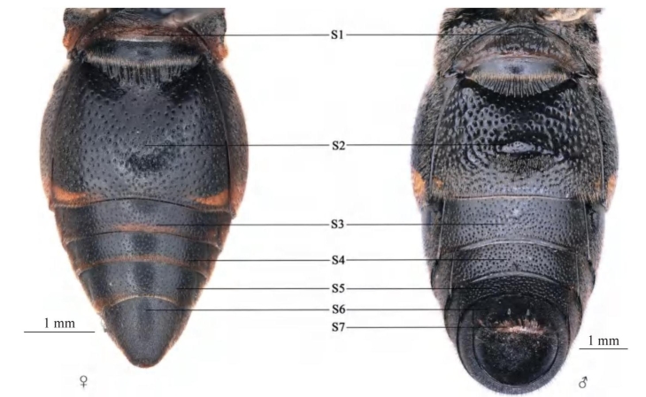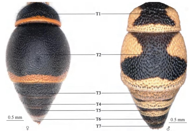 4.腹部第3~6节(metasomal segments 3-6) 腹部第3~6节背板及腹板的可见部分刻点、被毛状态、端部薄片、色斑及有无脊突等情况可作为分种特征。