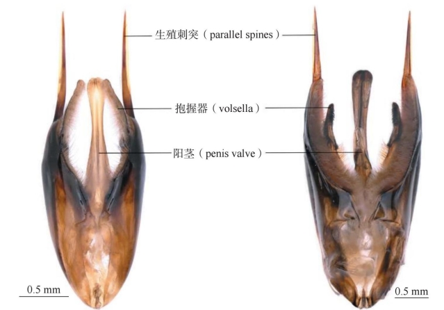 6.雄性外生殖器(male genitalia) 阳茎(penis valve)、抱握器(volsella)和生殖刺突(parallel spines)形状的差异是分类的重要特征,尤其是抱握器,其宽窄及端缘的构造是胡蜂科各分类阶元的重要鉴别特征。