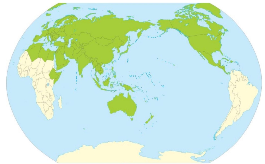 世界已知胡蜂亚科Vespinae 4属66种,其中胡蜂属Vespa、黄胡蜂属Vespula和长黄胡蜂属Dolichovespula分布于古北区、东洋区及新北区,原胡蜂属Provespa仅分布于东洋区,非洲及南美洲无该亚科的自然分布,目前已有人为传入。