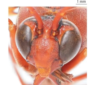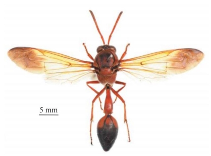 【形态特征】 该种以体除腹部后端半部外绝大部分为红色至红褐色明显区别于该属其他种类;腹部除第1节及第2节前半部外皆为黑色;前翅端半部明显为暗褐色;唇基宽约等于长,端缘近平截状。腹部第1节膨大的部分长于该节全长的1/2,端部宽约为基部宽的2倍。