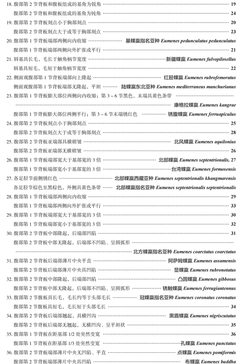 【形态特征】 雌性唇基端缘凹陷;雄性触角第13节端部尖、向后折回成尖钩状。前胸脊缺失;翅基片短,其后缘通常不超过旁翅基片的后缘;中胸背板无翅基片前脊,中胸侧板无侧纵脊;前足基节外侧具1条明显的脊;移去腹部第1节后明显可观察到并胸腹节后端部具1对突起;腹部第1节长柄状,其端部略凹,第2节背板端部具发达的薄片;雄性生殖器阳茎基侧突中部具1束细毛。