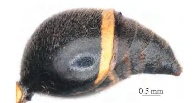【形态特征】 体黑色,具黄色斑,其中后胸背板黄色;前胸背板前基部,腹部第1、2节背板及第2节腹板后端部分别具黄色条带。头、胸、腹均密生长毛,前胸侧板及后颊区的毛长于头部的毛;触角柄节毛长于柄节宽。腹部第1节背板端部宽小于基部宽的3倍,长约为端部宽的3倍,距基部约1/3处突然变宽;第2节背板刻点极小且稀疏,小于腹部第1节背板刻点,基角呈锐角;第2节腹板具长毛,毛长与背板相同,刻点极小且稀疏。