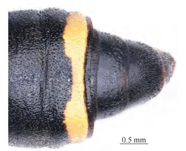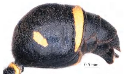 【形态特征】 体黑色,具黄色斑,其中后胸背板、翅基片黄色;前胸背板前基部,腹部第1、2节背板及第2节腹板端部分别具黄色条带,腹部第2节背板两侧具黄色圆斑,密生短毛,前胸侧板及后颊区的毛长于头部毛。腹部第1节背板中部密生刻点,刻点间距小于刻点直径;腹部第1节背板端部宽约为基部宽的2倍,长约为端部宽的3倍,距基部1/3处变宽;第2节背板刻点小且密集、小于胸部刻点,基角呈钝角,亚端部明显具横皱。