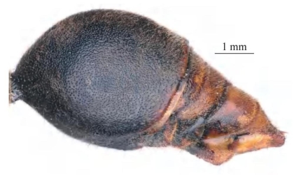 【形态特征】 体黑色,具锈红色斑;雌性唇基锈红色,雄性唇基黄色;前胸背板锈色,腹部第1、2节背板全黑色,剩余各节可见部分及足为锈红色。头、胸、腹均密生黄色毛;腹部第1节背板端部宽约为基部宽的2倍,长约为端部宽的3倍,距基部1/3处变宽,中部密生刻点,侧缘几乎平行;第2节背板刻点大且密集,基角呈锐角,端部无凹陷,端部薄片无反折、中央无凹陷;雄性阳茎端部圆形且中央无凹陷。