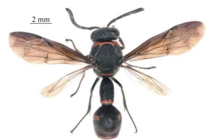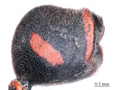 【形态特征】 体黑色,具红色斑;雌、雄性唇基均为黑色;前胸背板前基部,后胸背板,腹部第2节背板两侧斑,腹部第1、2节背板及第2节腹板端部条带为红色;足为纯黑色,前翅明显黑褐色。头、胸、腹均密生白色短毛。腹部第1节短粗,背板端部宽约为基部宽的2倍,长约为端部宽的3倍,距基部1/3处变宽,端部侧缘向内收缩;第2节背板刻点大且密集、刻点大于或等于胸部刻点,基角呈钝角,中部隆起,后端部凹陷,端部薄片无反折、中央浅凹陷。