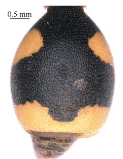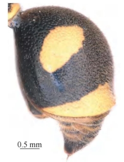【形态特征】 体黑色,具黄色斑;雌性唇基黄色且具黑色斑,雄性唇基黄色;前胸背板前基部,并胸腹节,腹部第1、2节背板两侧斑,后胸背板,腹部第1、2节背板及第2节腹板端部条带,以及足腿节端部至跗节为黄色;并胸腹节和腹部第1节背板的斑偶为锈红色。头、胸、腹均疏生黄色短毛。腹部第1节背板端部宽约为基部宽的2倍,长约为端部宽的3倍,距基部1/2处变宽,端部侧缘几乎平行;第2节背板刻点大且密集,基角呈锐角,端部浅凹陷。