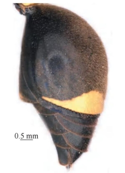 【形态特征】 体黑色,具黄色斑;雌性唇基黑色且具黄色斑,雄性唇基黄色;前胸背板前基部,后胸背板,腹部第1、2节背板及第2节腹板端部条带为黄色;足为纯黑色,腹部第1、2节背板两侧无黄色斑。头、胸、腹均疏生黄色短毛,前胸侧板及后颊区的毛长于头部毛。腹部第1节疏生刻点,背板端部宽约为基部宽的2倍,长约为端部宽的3倍,距基部1/2处变宽,中部疏生刻点,端部侧缘平行;第2节背板刻点大且稀疏,基角呈锐角。