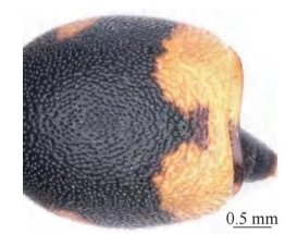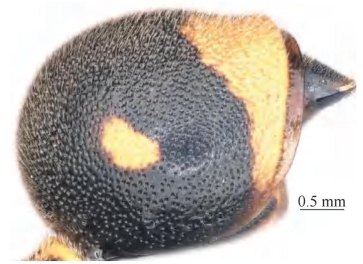 【形态特征】 体黑色,具黄色斑;雌性唇基黑色、部分标本中央具黄色斑,雄性唇基黄色;前胸背板前基部不连接的斑、后胸背板、腹部第2节背板两侧斑,腹部第1、2节背板及第2节腹板端部条带,以及足胫节及跗节的大部分为黄色(足的斑偶为锈红色)。头、胸、腹均密生黄色短毛。腹部第1节背板端部宽约为基部宽的3倍,长约为端部宽的3倍,距基部1/3处变宽,端部侧缘向外扩张、非平行;腹部第2节背板刻点大且密集,基角呈钝角,端部浅凹陷,薄片中部凹陷。