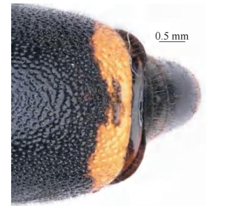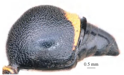 【形态特征】 体黑色,具少量黄色斑;雌性唇基黑色、刻点大、由基部到端部逐渐稀疏,雄性唇基黄色;前胸背板前基部短窄的斑,腹部第1、2节背板及第2节腹板端缘条带为黄色(或腹部纯黑色);足除少量黄褐色斑外绝大部分为黑色。头、胸、腹均密生黄色短毛。腹部第1节背板端部宽约为基部宽的2倍,长约为端部宽的4倍,由基部到端部逐渐变宽,端部侧缘向外扩张;腹部第2节背板刻点大且密集,基角呈钝角,端部浅凹陷,端部薄片反折,中央具浅凹陷。