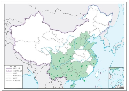 【地理分布】 北京、天津、河北、山西(吕梁)、上海、江苏(苏州)、浙江(丽水、台州)、江西(抚州、萍乡、宜春)、山东、湖南、广东(清远、肇庆)、广西(来宾、桂林、百色)、重庆(城口、开州、酉阳)、四川(绵阳、凉山、雅安、彭州、峨眉山)、贵州(遵义、凯里、黔南)、海南(昌江)、云南(文山、普洱、临沧、红河)、陕西(延安)、香港;日本,老挝,越南,韩国。