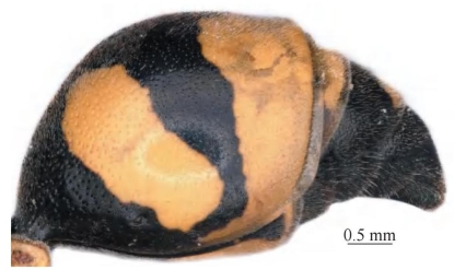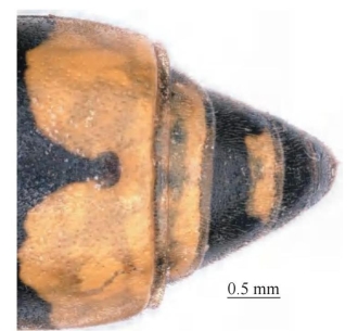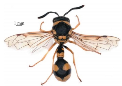 【形态特征】 体黑色,具大量橘黄色斑;雌性唇基基部黄色、端部黑色,雄性唇基纯黄色;前胸背板前基部除后端外、小盾片1对相邻的大圆斑、后胸背板、翅基片、并胸腹节大部分,腹部第1~4节背板端部条带,第2节背板两侧具几乎相连的宽大斑带,以及足从腿节除基部外至跗节末端均为橘黄色;头部后颊无毛,前胸侧区前基部无毛。腹部第1节背板端部宽约为基部宽的3倍,长约为端部宽的3倍,距基部1/3处变宽,端部侧缘平行;腹部第2节背板端部无凹陷,刻点小且稀疏,基角呈锐角,薄片无凹陷。