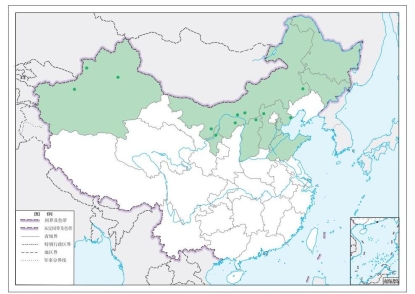 【地理分布】 黑龙江、吉林、内蒙古(鄂尔多斯、包头、武川、通辽、阿拉善)、天津、河北(秦皇岛、张家口)、山西(大同)、山东、宁夏(吴忠)、新疆(昌吉、伊犁、阿克苏);蒙古,俄罗斯(远东),印度,阿富汗,吉尔吉斯斯坦,哈萨克斯坦,伊朗,乌克兰。
