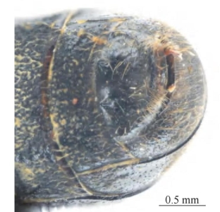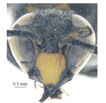 【形态特征】 体黑色,具少量黄色斑;雌性唇基黑色,雄性唇基除边缘外几乎全为黄色;前胸背板前基部具短窄的黄色斑;腹部第1、2节背板端部分别具黄色条带(条带中部连接或断开);唇基端部弧形凹陷,翅基片黄棕色,其中雄性凹陷较雌性深;雄性触角第13节向后折回至近第11节基部,呈尖钩状;翅基片淡棕色,无紫色光泽;腹部第1节背板基部具退化状横脊,且侧面观呈直角;雄性腹部第2节腹板中央仅略微凸起、不明显,第7节腹板基部具2个叶状突。