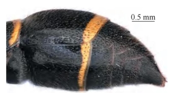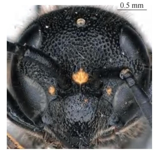 【形态特征】 体黑色,具黄色斑及金色长毛。雌性唇基黑色偶有黄色小斑,雄性唇基全黄色、外围具黑边;触角全黑色;前胸背板前基部,腹部第1、2节背板及第2节腹板端部分别具黄色条带,小盾片具2个黄色斑;足几乎全黑色,前足内侧黄色。头顶刻点密集呈网状,雌、雄性唇基刻点小且疏;胸部刻点整体大且密,前胸背板肩角明显且呈钝角;腹部刻点整体较头、胸部的刻点小且稀疏,各节端部刻点较其余部位略大;侧面观第2节背板无明显隆起,腹板平坦不圆滑,靠近基底沟处具明显棱角且呈直角。