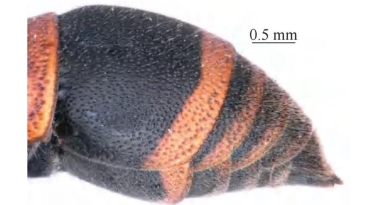 【形态特征】 体黑色,具红棕色斑和白色长毛。雌性唇基黑色,两侧具橙色斑,触角内侧黄色,雄性唇基全黄色;翅基片、小盾片黄色,前胸背板前基部、腹部第1~6节背板及第2节腹板端部分别具红棕色条带;足大部分为红棕色,腿节部分黑色。雌性唇基刻点小且疏,但较雄性的密;胸部刻点整体大且密,前胸背板肩角明显且呈直角;腹部刻点整体较头和胸部的刻点小且密集,各节刻点由基部到端部逐渐变大;腹部第2节背板侧面观毛稀疏,基部略隆起,腹板平坦、不圆滑,靠近基底沟处无棱角。