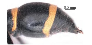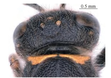 【形态特征】 体黑色,具黄色斑和金色长毛。雌性唇基黑色,触角黑色;前胸背板前基部,腹部第1、2节背板及第2节腹板端部分别具黄色条带;足大部分黑色。雌性唇基刻点小且疏;胸部整体刻点大且密,前胸背板肩角很短而不明显、呈钝角;腹部刻点较头、胸部的刻点小且稀疏,腹部第2节背板刻点较第1节背板刻点更稀疏,整个腹部密生金色短毛,第1节背板窄且基部宽与背板长几乎相等;侧面观第2节背板无明显隆起,腹板平坦,无凹陷及凸起,靠近基底沟处平坦且具极小棱角。