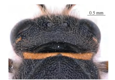 【形态特征】 体黑色,具黄棕色斑和金色长毛。雄性唇基全黄色,触角柄节内侧及翅基片黄色,前胸背板前基部、腹部第1~3节背板及第2~4节腹板端部分别具黄色条带;足大部分黄色,腿节基部黑色。雄性唇基刻点小且疏,端部凹陷呈半圆形;胸部刻点大且密,前胸背板肩角长而明显、呈锐角。腹部刻点较头、胸部的刻点小且密集,各节刻点大小分布均匀;侧面观第2节背板无隆起,腹板平坦,靠近基底沟处较平坦且无棱角。