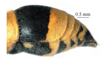 【形态特征】 体黑色,具大量黄色斑和密生白色长毛。雌性唇基黄色、中间具黑色斑,雄性唇基全黄色;触角之间具黄色大斑,雄性黄色斑与唇基相连;触角各节内侧黄色;腹部第1节背板大部分黄色,腹部第2节腹板两侧具两个黄色圆斑,前胸背板前基部、腹部第2~5节背板及第1~5节腹板端部分别具黄色条带;足大部分为金黄色。雌性唇基刻点小且疏、端部凹陷浅,雄性唇基基部和端部均凹陷且端部凹陷深;胸部整体刻点较大,前胸背板肩角明显且呈直角。腹部疏生短绒毛,刻点较头、胸部刻点小且疏,各节刻点大小分布均匀;侧面观第2节背板无明显隆起,腹板平坦,靠近基底沟处无棱角且略凹陷。