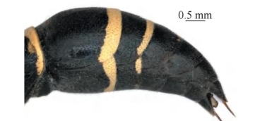 【形态特征】 体黑色,具黄色斑和白色长毛。雄性唇基黄色,触角柄节及端部黄色;前胸背板前基部、腹部第1~3节背板及第2节腹板端部分别具黄色条带;足大部分为金黄色,内侧黑色。雄性唇基刻点小且疏,且端部较深呈半圆形。胸部整体刻点较大,前胸背板肩角较明显且呈钝角。腹部整体疏生短毛,刻点较头、胸部的刻点明显小且稀疏,各节刻点由基部到端部逐渐变稀疏;侧面观第2节背板略隆起呈弧形,腹板平坦,靠近基底沟处无棱角且平滑。