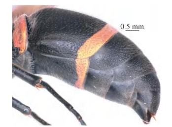 【形态特征】 体黑色,具红色斑和金色长毛。雌、雄性唇基全黑色,雄性中间具白色斑;雌、雄性触角均黑色;前胸背板前基部,腹部第1、2节背板及第2节腹板端部分别具红色条带;足大部分为黑色。雌性唇基刻点小且密,两侧密生长毛,端部凹陷浅;雄性唇基端部凹陷较雌性深,两侧密生长毛。胸部整体刻点较大,前胸背板肩角较小且向内收紧呈锐角。腹部整体疏生短毛,刻点较头、胸部的刻点小且疏浅,各节刻点由基部到端部逐渐变密;侧面观第2节背板基部隆起呈角度,整个腹板向内凹陷,靠近基底沟处无棱角且凹陷明显。