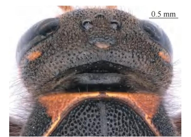【形态特征】 体黑色,具橘黄色斑和金色长毛。雌性唇基黑色、基部两侧具橘色斑,雄性唇基黄色;触角内侧橘黄色;前胸背板前基部及内缘,腹部第1、2节背板及第2节腹板端部分别具黄色条带;足胫节黄色,腿节黑色。雌性唇基刻点小且疏,雄性唇基刻点较雌性更小,雌、雄性唇基端部凹陷极浅;雄性触角细长,各节长均大于宽。胸部整体刻点较大,前胸背板肩角较短呈钝角。腹部整体疏生短毛,第1节背板刻点大小与头、胸部的刻点一致,其余各节刻点较头、胸部的刻点小且疏浅;侧面观第2节背板近基部隆起呈角度,腹板平坦,靠近基底沟处具明显棱角且呈直角。