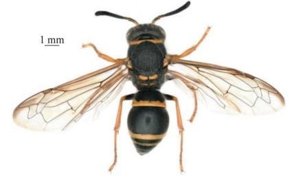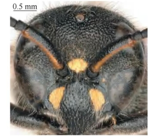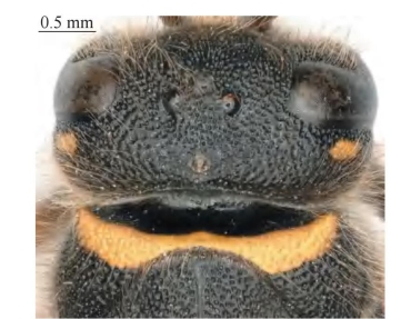 【形态特征】 体黑色,具黄色斑和金色长毛。雌性唇基黑色,基部两侧具黄色斑,雄性唇基全黄色;触角内侧、翅基片、小盾片、后胸背板黄色;前胸背板前基部、腹部第1~3节背板及第2节腹板端部分别具黄色条带;足大部分为黄色。雌性唇基刻点小且疏,雄性唇基刻点大小与雌性的一致,端部凹陷深,具薄片。胸部整体刻点较大,前胸背板肩角宽且较短、呈直角。腹部整体密生长毛,刻点较头、胸部的刻点小且疏浅,第1节背板窄,第2节背板宽,各节刻点大小分布均匀;侧面观第2节背板无明显隆起,腹板平坦,靠近基底沟处具明显棱角且呈钝角。
