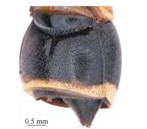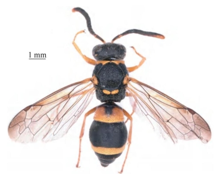 【形态特征】 体黑色,具橙黄色斑和金色短毛。雌性唇基黑色、基部两侧具橙黄色斑,雄性唇基黄色;触角柄节、小盾片、翅基片黄色;腹部第1节背板几乎全黄色,中间小部分黑色;前胸背板前基部、腹部第2节背板及第2节腹板端部分别具黄色条带;足大部分为锈红色。雌性唇基刻点小且疏,雄性刻点较雌性更疏;胸部整体刻点较大,前胸背板肩角钝且呈直角。腹部整体密生极短绒毛,各节刻点整体较头、胸部的刻点明显小且疏;第2节背板几乎无毛,刻点由基部到端部逐渐变密;侧面观第2节背板无隆起,腹板呈圆弧状,靠近基底沟处基部中央具明显纵沟。