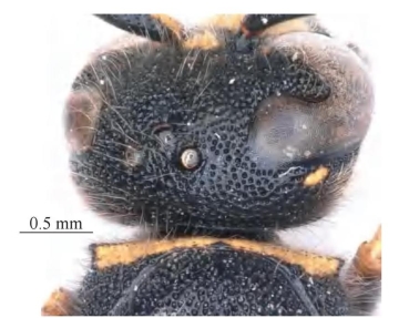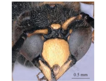 【形态特征】 体黑色,具黄色斑和白色长毛。雄性唇基黄色;触角柄节及端部腹面黄色;前胸背板前基部、腹部第1~3节背板及第2节腹板端部分别具黄色条带;足大部分为黄色,腿节基部黑色。雄性触角柄节毛长于柄节宽,唇基刻点小且疏,密生白色长毛,端部凹陷深,具明显薄片;胸部整体刻点较大,前胸背板肩角较长、呈锐角。腹部整体疏生短毛,刻点较头和胸部的小且密集,各节刻点大小分布均匀;侧面观第2节背板无隆起,腹板平坦,靠近基底沟处无棱角。