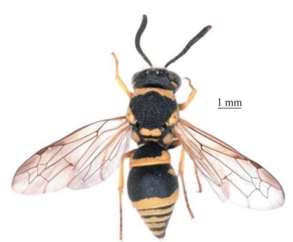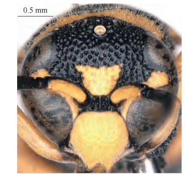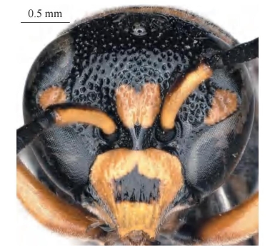 【形态特征】 体黑色,具大量黄色斑,其中前胸背板前基部具宽的完整黄色条带,中间不间断;足大部分为黄棕色。头顶毛均长于单眼直径;雌性唇基宽等于长,中部平坦区明显且几乎从基部向端部延长,仅端部略凹平,两侧脊间具长的、细的纵皱,纵皱间略光滑;雄性唇基疏生小刻点,端缘弧形凹口深;雄性触角第13节向后折回至第11节中部。前胸背板的前斜面具无规则的刻点,前胸脊两侧发达,明显呈尖角状;后胸背板垂直面光滑无刻点;旁翅基片短粗;并胸腹节背区基部无短横脊。腹部刻点均小于胸部刻点,第2节腹板基底沟较深。