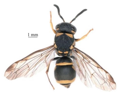 【形态特征】 体黑色,具大量黄色斑;前翅缘室除基部外均为褐色斑;腹部第1节前斜面和侧面黑色。雌性唇基宽大于长,密生小刻点,平坦区自中部开始向端部延长,端缘凹陷浅,两侧齿钝,两侧脊间暗、刻点及纵皱不明显;雄性唇基端缘凹陷较雌性深,呈三角形而非弧形;雄性触角第13节向后折回至第10节端部。前胸背板前斜面中间具1排纵向的规则刻点,且刻点间具纵脊,占据前胸背板前斜面的1/3;并胸腹节背区基部具2条弯曲的短横脊。腹部刻点小于胸部刻点,且刻点浅平;腹部第1节背板钟形;第3节背板端部条带不完整,仅中间具条带;第2节腹板基部具中纵沟。