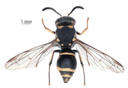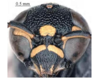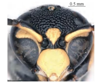 【形态特征】 体黑色,具黄色斑;前翅缘室具褐色斑;腹部第3节背板端部仅两侧具黄色斑。雌性唇基平坦区从靠近基部开始延长至端部,铲状非常明显,两侧脊间的平坦区粗糙且具纵皱和刻点,端缘仅略凹陷,两侧齿钝不明显,两侧齿间距等于两触角窝内缘间距;雄性唇基端缘凹陷明显较雌性深、呈弧形,唇基表面有均匀大刻点;雄性触角第13节向后折回至第11节基部。前胸背板前斜面中间无刻点,具1条横向压痕,似窝穴;旁翅基片细长呈拱形;并胸腹节背区基部无短横脊。腹部刻点较胸部刻点更浅、更稀疏;第2节腹板基底沟较深,基部无中纵沟。