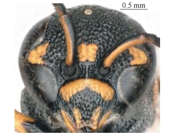 【形态特征】 体黑色,明显具黄色斑;前翅缘室仅端部具褐色斑。唇基密生刻点,雌性唇基端部和基部各具黄色斑,平坦区靠近端部,两侧脊间纵皱不明显,唇基端缘凹陷均较浅且呈角度,但非弧形,其中雄性凹陷较雌性略深;前胸脊整体发达,背侧中央向内部弯曲,前斜面无1排规则的刻点;并胸腹节背区基部具极微弱的短横脊;雄性触角第13节较粗呈钩状,向后折回至第10节中部。腹部第2节腹板密生刻点,中部略稀疏,且向端部刻点逐渐变深,大于腹部第2节背板刻点,基部具短中纵沟。