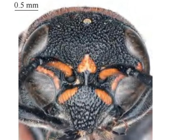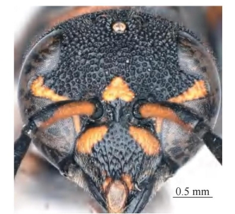 【形态特征】 体黑色,具黄棕色和红棕色斑;翅为黑褐色,具紫色光泽。雌性唇基宽大于长,唇基平坦区靠近端部,两侧脊间纵皱不明显,端缘微凹,密生大刻点,刻点之间具密集纵脊;雄性唇基黑色,基部和端部各具黄色斑,密生刻点,端缘凹陷较雌性明显更深,凹陷呈深U形且端部无透明区;雄性触角第13节较短小,向后折回至第11节基部。前胸背板前斜面中间无刻点,具1条横向压痕、似窝穴;并胸腹节背区基部无短横脊,且背区两侧具发达的脊。腹部刻点均小于胸部刻点,且各节背板刻点大小一致,第2节腹板基部凸起、呈明显的角度,基底沟较深,基部具深的中纵沟。