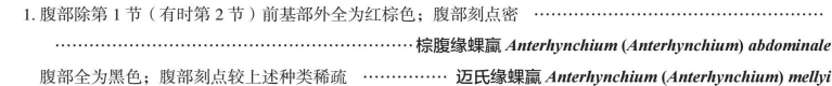 【形态特征】 体粗壮,中型。下颚须6节、下唇须4节。雌性头顶具1对窝穴,窝穴周围常具平坦区。翅基片狭窄,长大于宽,后缘微凹,后缘短于旁翅基片后缘;后胸背板两侧无凸起;并胸腹节背区低于后胸背板,侧面观并胸腹节背区中部两侧常具1对齿突。腹部无柄,第1节背板宽大于第2节宽的1/2,背板前斜面与背区无横脊分界、呈弧形;雄性中足腿节基部无凹陷。