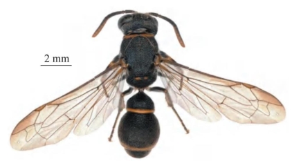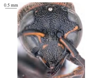 【形态特征】 体黑色,具黄棕色斑;唇基基部具1对侧斑,腹部第2节基部两侧无黄色斑;密生刻点和棕色毛。唇基宽大于长(1.1倍),端部略凹陷,两侧明显呈尖齿状,两齿间距是唇基宽的0.2倍;额区、头顶及复眼后缘刻点呈网状;前单眼的直径等于前单眼到后单眼的距离;后胸背板具中等密度刻点,具倾斜面,中部凹陷;并胸腹节后区端部的腹瓣细长,呈刺状,端部向上翘。腹部第1节背板粗糙刻点较胸部刻点小且稀疏,背板宽为长的2.0倍,为第2节宽的0.7倍;第2节背板中部无凸起,端部具窄的薄片;第2节腹板基部凹陷,明显具中纵沟。