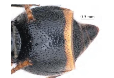 【形态特征】 体被棕色毛,具大量黄色斑;翅黑褐色且具紫色光泽。雌、雄性唇基粗糙,密生刻点,端缘凹陷且两侧呈齿状;雄性触角第12、13节小,第13节向后折回至第11节端部;中胸背板前侧区具深的刻点,刻点间无脊。腹部第2节腹板基部均匀凹陷,中间具弱纵沟;雄性第8节腹片端部呈平截状;雄性抱握器细长。