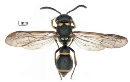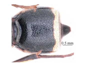 【形态特征】 体黑色,具黄色斑;唇基端缘较宽,端缘宽为唇基总宽的1/4;并胸腹节后区端部的腹瓣薄片短宽,不呈刺状,端部无翘起;后胸背板具小齿,具窄的水平面和较长垂直面;雄性触角第12、13节短小,第13节逐渐变细,即基部比端部明显粗。腹部第2节背板中部无凸起,腹板基部明显凸起,中间无纵沟,密生刻点。