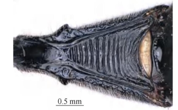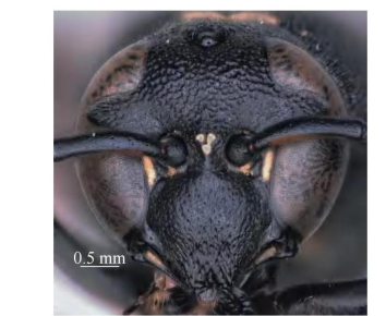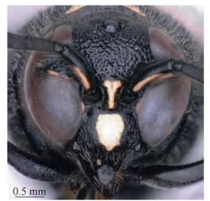 【形态特征】 体绝大部分为黑色,具少量黄白色斑,仅额区下侧窄且具短条带。雄性唇基大斑和端部小斑,前胸背板前缘中部窄斑,腹部第1、2节背板端缘窄条带为黄白色。头部刻点粗糙,具短绒毛;后头脊缺失。中胸盾片无盾纵沟,网状刻点间具微小刻点;中胸侧板具侧纵脊,刻点明显网状。腹部第2节腹板侧面观在近基部处急剧隆起,腹部第1节腹面观其后平坦,刻点似背板。