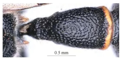 【形态特征】 体黑色,具少量棕黄色斑,其中腹部第1、2节背板及第2节腹板端部具窄的黄色条带。体密生刻点,略呈网状;雌性唇基密生白色长毛,端部两侧呈小的齿状(几乎被长毛遮挡)。前胸背板前缘中部无瘤状突,尖角明显;后胸背板具横向凸起、侧板具横皱和刻点。腹部第1节背板密生粗糙大刻点、呈网状,第2节背板除端部黄色条带外密生粗糙刻点,端缘具透明薄片,薄片基部具1排短的纵皱。