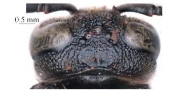 【形态特征】 雌性唇基长略大于宽,靠近基部1/2处黄色或具黄色斑,唇基具粗糙刻点,刻点直径大于刻点间距;端部窄且端缘中部略凹陷,两侧齿状不明显。雄性唇基黄色,长明显大于宽,端缘浅弧形凹陷,具白毛;雌性头顶窝穴平坦区外缘明显宽于后单眼外缘,未接近复眼内缘,窝穴区域几乎无刻点。腹部背板第1、2节后端分别具完整的黄色条带,条带较黄刻代喙蜾蠃Dirhynchiumflavopunctatum和小窝代喙蜾蠃Dirhynchium melanopterum的明显窄;腹部刻点不及胸部刻点粗糙。