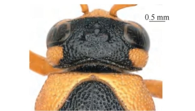 【形态特征】 体绝大部分为黄棕色,额区、头顶、触角鞭节、中胸盾片、后胸背板、并胸腹节中部、腹部第2节背板中部斑及第3~5节为黑色。头顶窝穴较单佳盾蜾蠃Euodynerus (Euodynerus)dantici小且平坦,呈退化状;唇基长约等于宽,刻点略稀疏,纵皱弱、不明显,雌、雄性唇基端缘均浅V形凹陷。翅基片密生小刻点,后缘向内弯曲;小盾片除中部外密生刻点;腹部第2节背板端部无透明薄片,中部刻点较端部略稀疏且浅,仅端缘处刻点不粗糙、无明显凹陷。